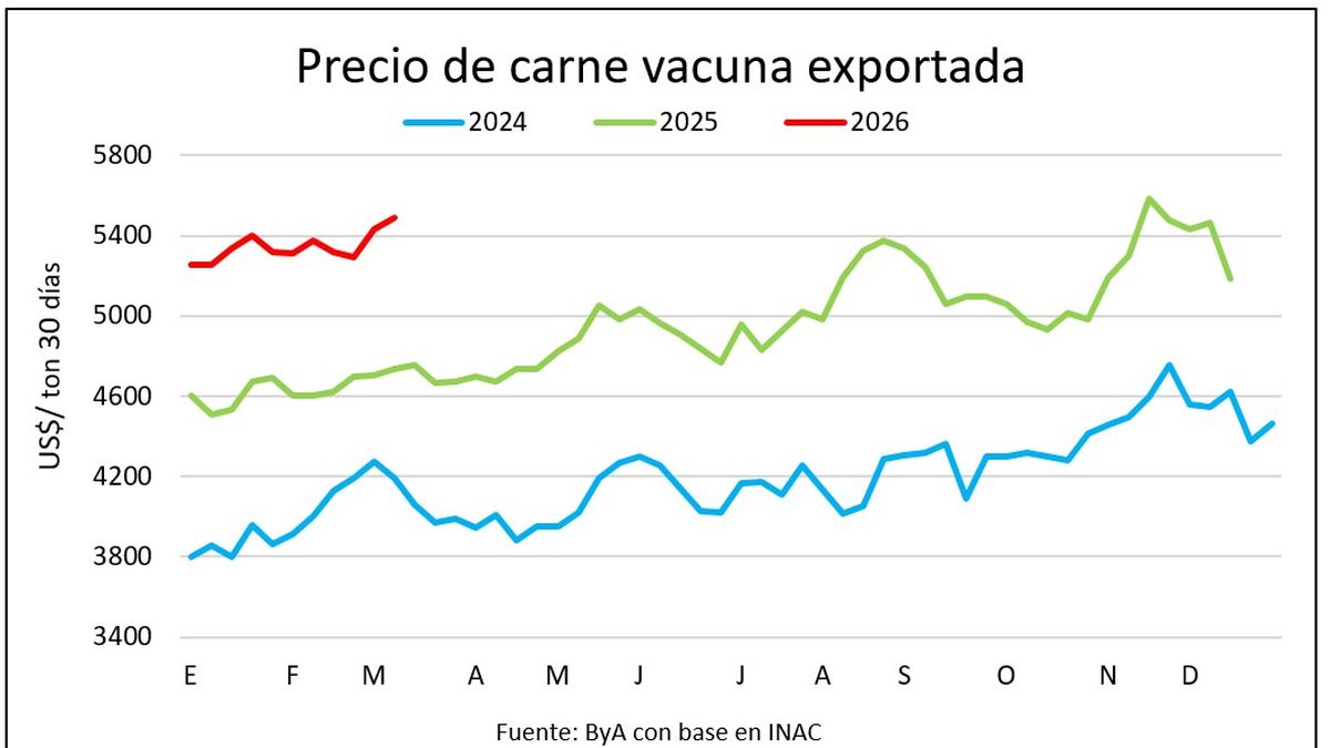 A nivel externo, la demanda de carne vacuna se mantiene excepcionalmente firme. China muestra un gran dinamismo en volúmenes y precios, con un primer bimestre récord en sus importaciones. La Unión Europea también sostiene una demanda robusta. Aunque el volumen total de exportaciones de Uruguay bajó un 8,7% a todos los destinos en lo que va de 2026, Estados Unidos sigue siendo el principal destino. Los datos preliminares de INAC indican que el precio semanal de exportación de carne vacuna fue de US$ 5.962 por tonelada, y US$ 5.489 por tonelada en los últimos 30 días móviles, valores cercanos a máximos históricos.